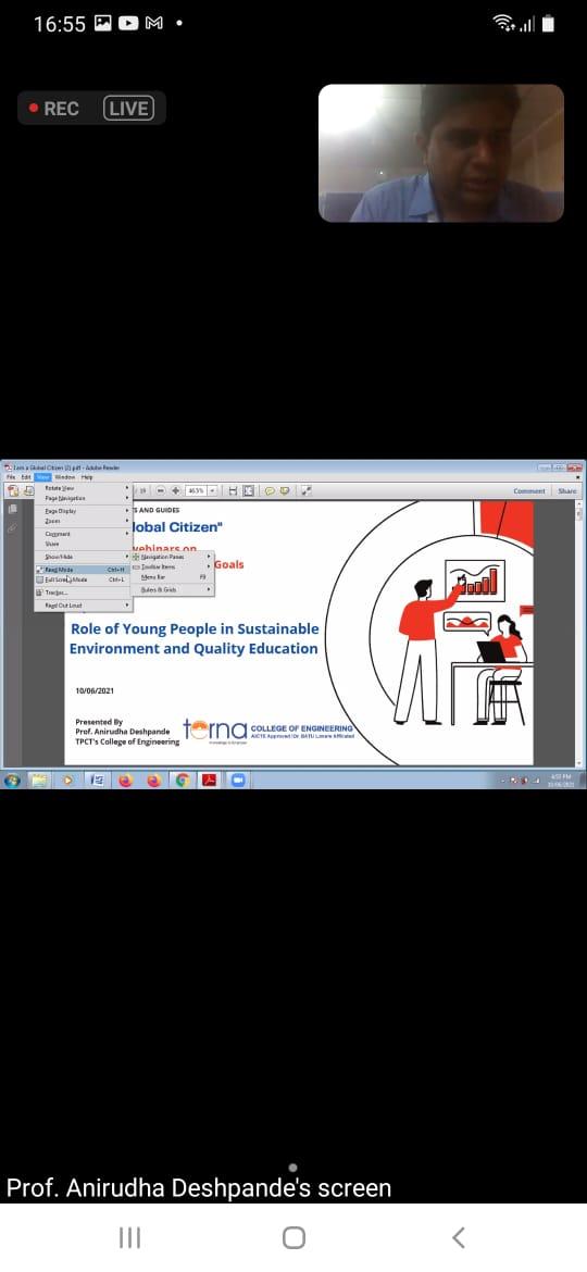 The Guest Speaker, Prof Anirudha Deshpande, TPCT’s college of Engineering addressed the participants on Role of Young People in Sustainable Environment and Quality Education. He stressed that the combination of skills and UHV (Universal Human Values) is required to achieve SDGs. He emphasized that solution to all the problems is quality education.