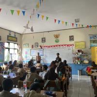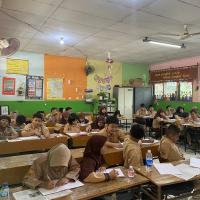 Tidak jauh berbeda, di kelas lain, siswa-siswi juga sedang mengikuti kegiatan belajar. Beberapa guru berdiri di depan kelas, memberikan arahan sambil sesekali berinteraksi dengan murid-murid. Ruangan dihiasi bendera warna-warni yang menambah semarak suasana.