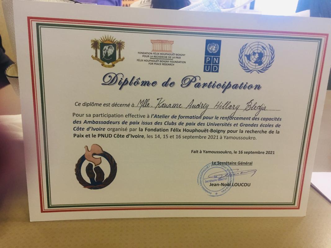 Ce fut un immense plaisir pour moi, en tant que jeune Ambassadrice de paix d’avoir participé durant 3 jours à l’atelier de formation pour le Renforcement des Capacités des Ambassadeurs de Paix issus des Universités et Grandes Écoles de CI organisé par la La Fondation Félix Houphouët-Boigny pour la recherche de la paix et le Programme des Nations Unies pour le développement - PNUD. C’était une super expérience, et des formations en plus à ajouter à mon CV☺️. Il est important et crucial pour nous jeunes de nous intéresser à la question de Consolidation de la Paix afin d’être de très bon Ambassadeurs pour notre Communauté. J’invite donc mes amis à s’impliquer davantage dans les questions de paix! Je suis et je serai toujours une bonne Ambassadrice pour la Paix ✌🏼 ! #JeunesBlogueursCi #PourLaPaixJeMengage #refwadha #worldscouting #worldscoutconference #MessengersOfPeace #scout #scoutinginafrica #ASCCI #engagementdesjeunes #youthengagement