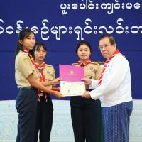 Then, Patron of Myanmar Scout association Dr. Tin Myo Win, Yangon Region Minister for Planning and Finance Scout Master U Myint Thaung, Chairman of UMFCCI, U Zaw Min Win presented prizes to 10 scouts form universities, who stood out in philanthropic work.
