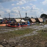 Besides heat and drought, we also have to cope with more showers with heavy rain, with an amount of water which would normally pour from the sky normally in a month, falling in a few hours. The ground can't deal with it, so it floods in and around tents, everything gets wet, the soil turns muddy and if you're ulucky, the drain gets blocked as well, with all kinds of effects for the well-being and health of scouts.