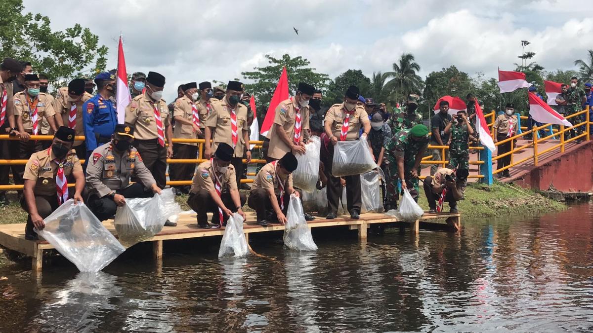 The Opening Ceremony of the National Community Development Camp 2021 or Perkemahan Wirakarya Nasional 2021 held in three different locations, namely at the Abdurrahman Sayoeti Musa Scout Camp, Muaro Jambi Regency, Subcamp at Singoan Village Field, Batanghari Regency and the opening by Kak Zainudin Amali through a zoom meeting in Jakarta.