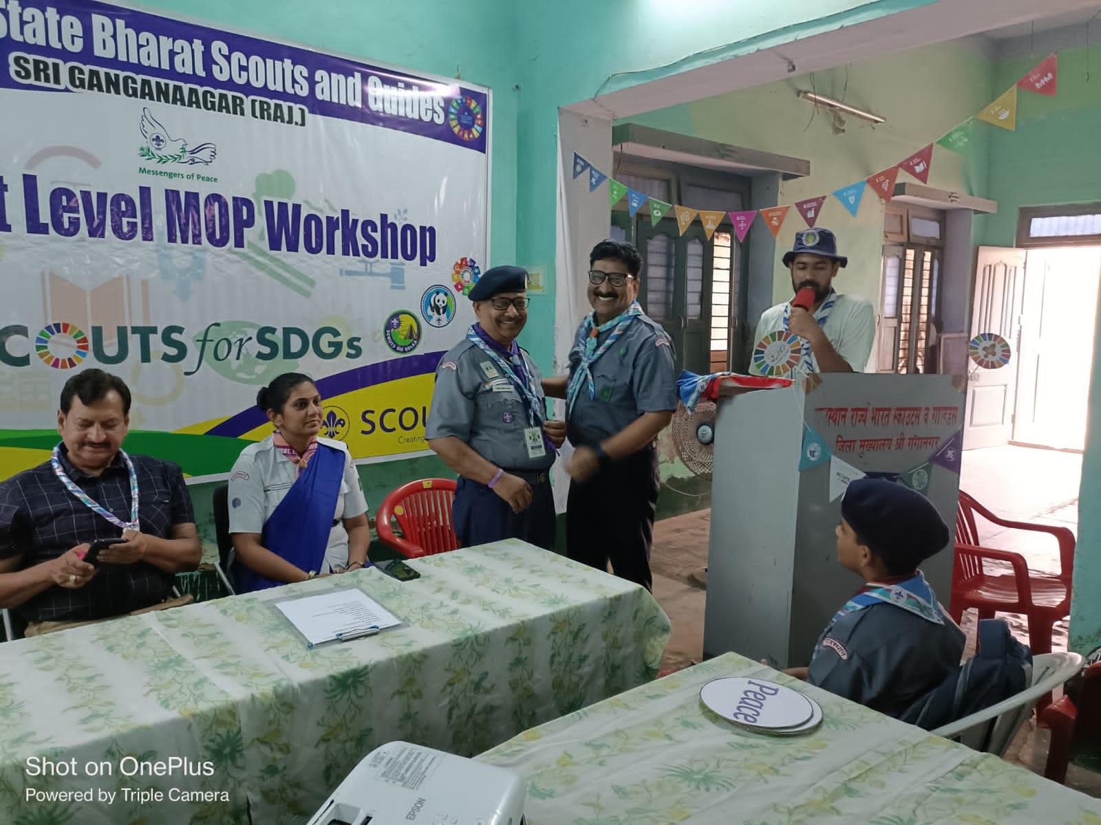 District level Messenger of Peace workshop was organized under the aegis of Rajasthan State Bharat Scouts and Guides District Headquarters, Sriganganagar, in which 34 participants from all the local associations of district Sriganganagar participated. Messenger of Peace District Coordinator Angrez Singh said that this district level In the workshop, children were given information to participate in national and international level activities. Shashi Kumar Sharma, District Training Commissioner gave information about the history of Messenger of Peace.State Organization Commissioner (Guide) Ms. Suyash Lodha from Jaipur and Mr. Manmahendra Singh Bhati, Assistant State Organization Commissioner from Bikaner joined the workshop through online medium and inspired the participants who participated in the workshop to do activities in this regard. Advocate Vinod Kumar Goyal, President of the local association Sriganganagar, attended the workshop as the chief guest. He told about the benefits derived from the Messenger of Peace program.