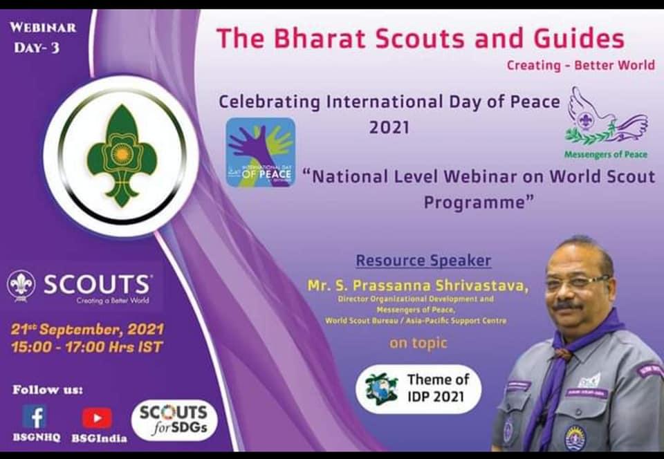 21 Sept: The Bharat Scouts and Guides Celebrated International Day of Peace 2021. National Level Webinar on World Programme. Today it was on THEME OF IDP 2021.