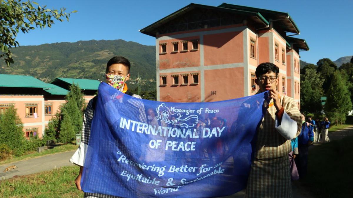 Rigzhung Rovers celebrated International Day of Peace at College of Language and Culture Studies. Rigzhung Rovers requested all the students to wear either blue or white dress since the color for peace is white and blue. The Dean of Student Affairs, Mr. Sangay Phuntsho graced the walk. At 7:30 a.m. rovers began to distribute the chocolates and peace message to students who had classes early (first Years). Thus, wearing the color of peace, rovers and others students (second and third year’s student) started the walk at around 8:30am from guest house parking till academic block with banners filled with message and theme. The peace tree was placed near academic block to write peace message or message to their beloved one.