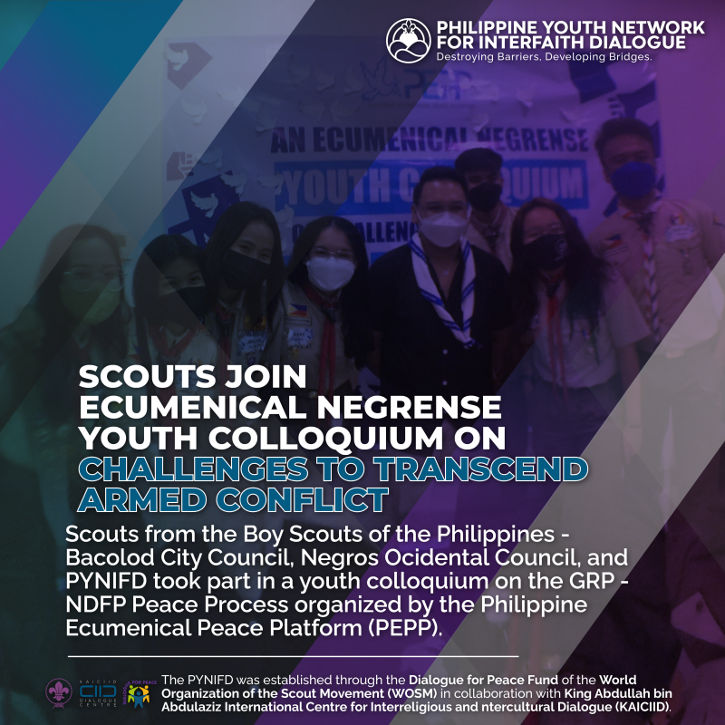 Scouts from the Boy Scouts of the Philippines - Bacolod City Council through the Senior Scout Committee, Boy Scouts of the Philippines - Negros Occidental Council, and the Philippine Youth Network for Interfaith Dialogue took part in a youth colloquium on the Government of the Republic of the Philippines (GRP) - National Democratic Front
