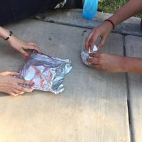 Pusimos a cocinar un huevo estrellado usando la energía solar. Colocamos el huevo sobre aluminio y creamos un tipo hornito envolviendo todo para aprovechar el calor al máximo.