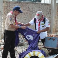 Among a number of memorabilia that we were saved, perhaps the interesting one is a large-sized WOSM flag. When finished taking some memorabilia that can be saved, we were going to go up from the location. Suddenly my eyes look at the purple cloth behind a broken box that has been neglected.