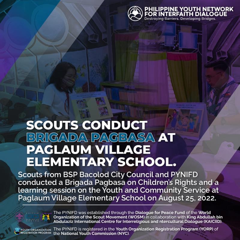Scouts from the Boy Scouts of the Philippines Bacolod City Council and the Philippine Youth Network for Interfaith Dialogue conducted a Brigada Pagbasa and learning session on the Youth and Community Service at Paglaum Village Elementary School on August 25, 2022.
