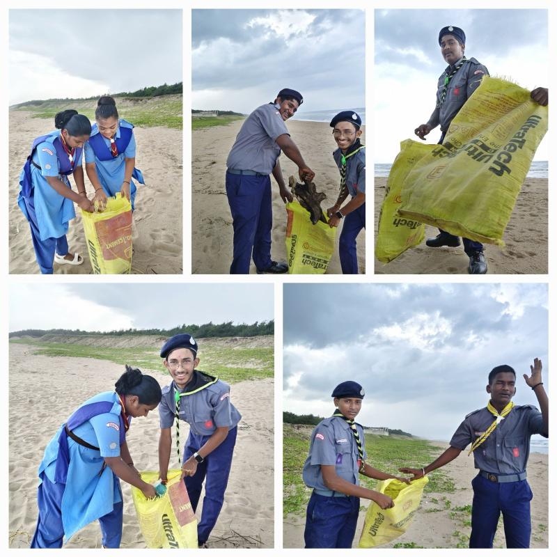 Alongside these social initiatives, the Scouts took part in the Beach Cleaning Campaign – Day 2, an effort to protect and preserve Odisha’s beautiful coastline. Led by Aniket Kumar Nayak, Hemsundar, T. Gunasekhar, Iswar Rao, and Sagar Sahu, the Scouts engaged in cleaning activities to raise awareness about environmental responsibility and sustainability — reminding everyone that caring for the planet is also a form of service.