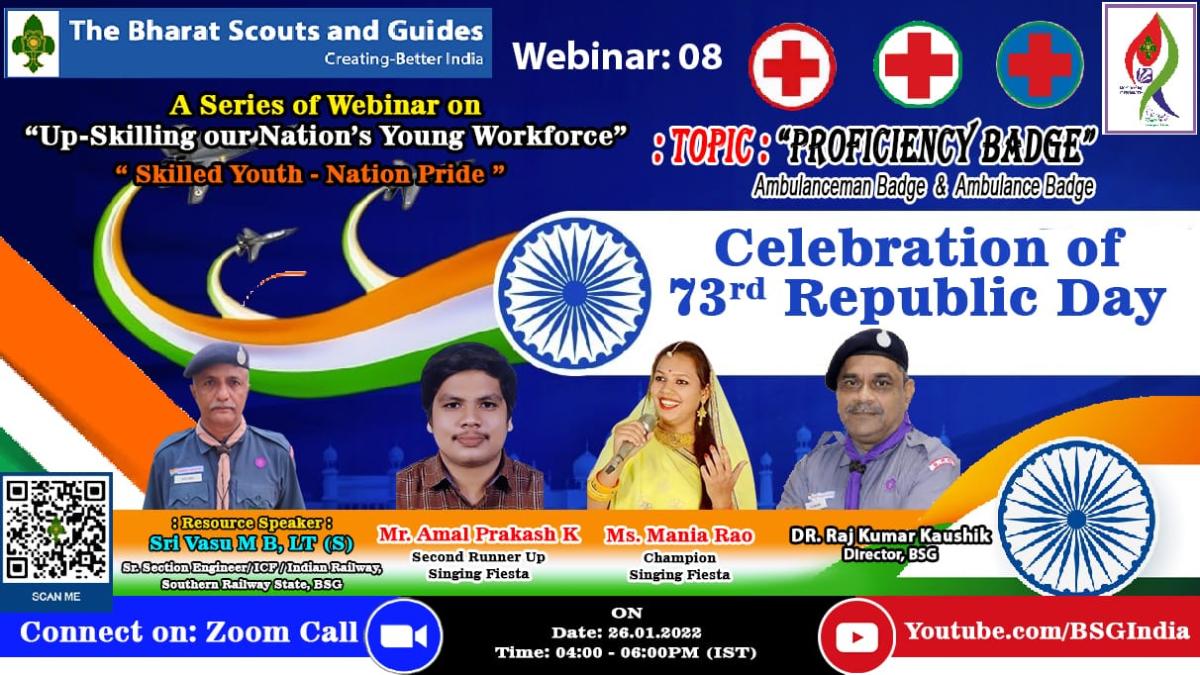 A SERIES OF WEBINARS ON "UP-SKILLING OUR NATION'S YOUNG WORKFORCE" was organised by the Bharat Scouts and Guides, National Headquarters on every ‘Wednesday’ starting from 08th December 2021. The series of webinar on “UP-SKILLING OUR NATION’S YOUNG WORKFORCE” to motivate a large number of youth to take up skill development training. The training focused on how to do something specific and results in a learned skill that can be put to immediate use to become self-reliant with the theme “Skilled Youth - Nation’s pride” The topic – Proficiency Badge – Ambulanceman Badge and Ambulance Badge was held on 26.01.2022 from 4pm to 6pm. The Resource Speaker is Sri.VASU.M.B LT (S), Senior Section Engineer, ICF, Indian Railways, Southern Railway State, BSG. Sri.AMAL PRAKASH.K, Second Runnerup of the Singing Fiesta and Ms.MANIA RAO gave excellent performance on the occasion of the Republic Day. Dr.Raj Kumar Kaushik, Director BSG gave opening blessings.Executive Director Sri.Krishnaswamy.R gave blessings.Well come by Sri. Alendra Sharma AD North East Region, Leader of the Webinar Series & vote for thanks by Sri.Babloo Goswami AD Eastern Region. The webinar gave theoretical and practical knowledge on first aid and covered the syllabus for Ambulanceman Badge and Ambulance Badge. It was a very useful and informative webinar. The dynamic MCs were Sri.Vikash and Smt.Priyanka.