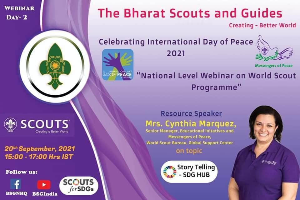 20 Sept: The Bharat Scouts and Guides Celebrating International Day of Peace 2021. National Level Webinar on World Programme. Today it was on STORY TELLING& SCOUTS FOR SDGs. Resource Speaker -Cynthia Marquez Sr. Manager Education Initiatives & Messenger of Peace. www.scout.org/node/152930 #bsgindia #IDP2021 #storytelling #Scouts4SDGs #bsgmp #bsgdashivpuri