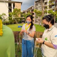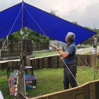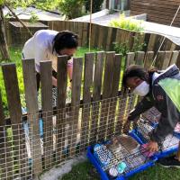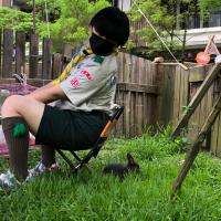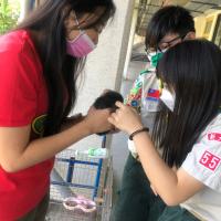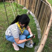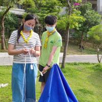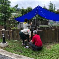 另外,此次服務活動我們也結合了童軍技能,原先的兔子被學校安置在校園一隅的牆角。利用放學時間,我們將校園內圍籬用炊事帳改建為兔子園,將公母兔安置在下方可遮陽避雨處,白天可以讓兔子於圍籬中跑跑,學生也可在安全範圍與其互動,晚上有安全的籠子可以待,不用擔心野狗攻擊。