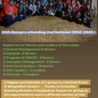 National Community Based Scout Camp took place for the 2nd time in Bangladesh . It was held at Sabrang , Teknaf . UK , India and Nepal contingent joined with us in the camp . 220 open scout groups successfully took part in the camp . Education Minister declared the opening . 13th Hussars Open Rover Scout Group was the most largest team having service team in all sectors and participants along with the officials . About 2100 participants , service and officials were there at the camp . It was a successfull one indeed .