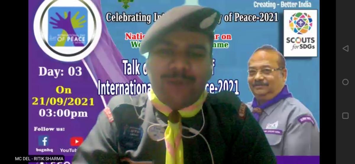 In previous years,numerous activities are held in celebration of this day by several NSO's engaging thousands of young people in understanding people action. Firstly I would like to thanks the Hosts who come up with such a great idea of having the 3days online webinar via Zoom from the first day of session till 21stSept. 3 days. Today is the best have 21 enjoyed a lot & those the 1st day of sessions. I enjoyed a lot & gave too much knowledge got to know many things surrounded day. National Vice President & Mr. Madhu Avala Deputy International Commissioner scout valuable remarks of the webinar shared by Mr. Raj Kumar Kaushik Director BSG & our joint Director Smt. Darshana Pakadkar Mam deliver vote of Thnx