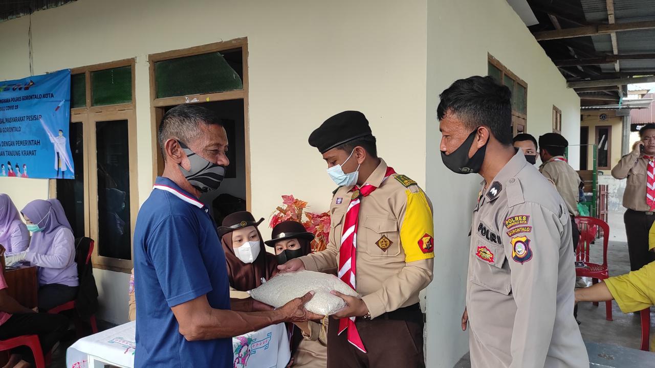 Program vaksinasi dan distribusi sembako, Saka Bhayangkara, bersama dengan Polres Gorontalo Kota, Dinas Kesehatan, dan Pemda Kelurahan Tanjung Kramat Mendirikan Posko Terpusat. Selain itu juga kami melakukan aksi door to door untuk menjangkau masyarakat secara menyeluruh.