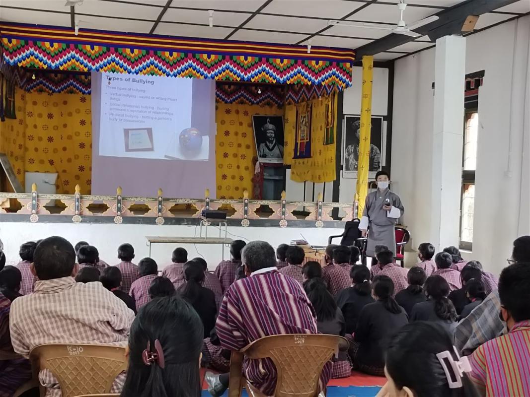 Awareness and advocacy program on Antibullying on the theme "Don't Stand by- Stand up, stand strong together. Don't stand by, stand up against bullying" was conducted at MP hall of Khamdang Lower Secondary School on April 4th, 2022. Awareness program was attended by the students from grade 7 and 8 and all staff of Khamdang school.