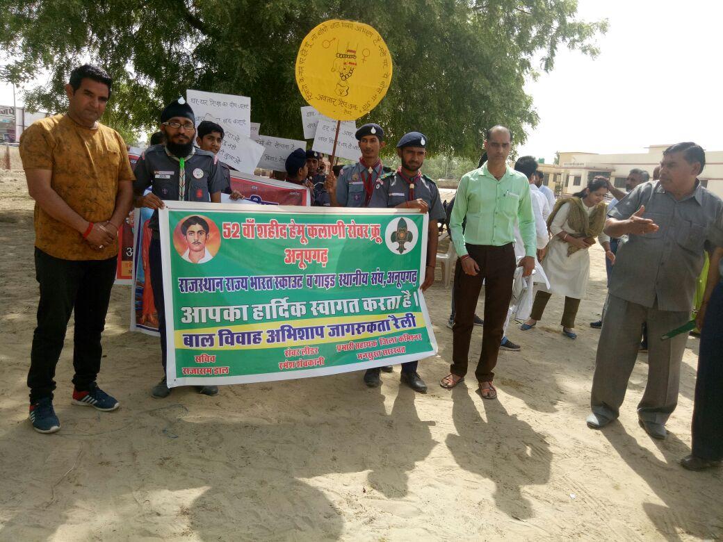 राजस्थान राज्य भारत स्काउट व गाइड के 52वां शहीद हेमू कालाणी रोवर क्रू ने बाल विवाह एक अभिशाप जागरूकता रैली का आयोजन किया गया। जागरूकता रैली को अपर मुख्य न्यायिक मजिस्ट्रेट अरुण गोदारा, न्यायिक मजिस्ट्रेट सुजीत तंवर, उप जिला कलेक्टर मनमोहन मीणा, नगर पालिका अध्यक्ष निर्मला गोदारा ने हरी झंडी दिखाकर रवाना किया। बैनर और पोस्टर के माध्यम से लोगो को जागरूक किया गया।समापन के अवसर पर हनुमान मंदिर में स्थानीय संघ सचिव राजाराम डाल ने बाल विवाह से होने वाले दुष्प्रभावों के बारे में जानकारी देते हुए कहा कि बाल विवाह करना कानूनी अपराध है।