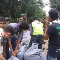 অঝোর স্রোত উপেক্ষা করে সেনাবাহিনী এবং রোভার স্কাউট রা মিলে বাঁধ টি পুনঃনির্মাণ করে...