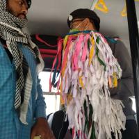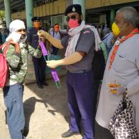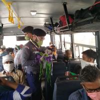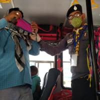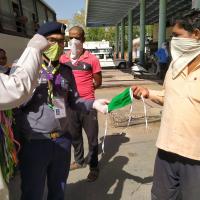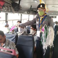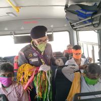 बस में जाते प्रवासी मजदूरों को मास्क व पानी की बोतल भेट किए गए