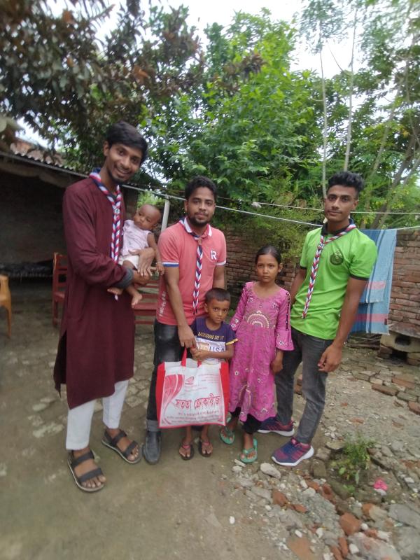 আমরা চাঁপাইনবাবগঞ্জ পলিটেকনিক ইনস্টিটিউট রোভার স্কাউট গ্রুপের সবাই একসাথে নিজেদের মধ্যে চাঁদা তুলে হত দরিদ্রদের মাঝে ত্রাণ বিতরণ কার্যক্রম পরিচালনা করা হয় । এখানে আমরা ৫জন ছিলাম। একটা বন্যায় ক্ষতিগ্রস্ত এলাকায় অভিযান চালিয়ে তাদের ত্রাণ বিতরণ করা হয়