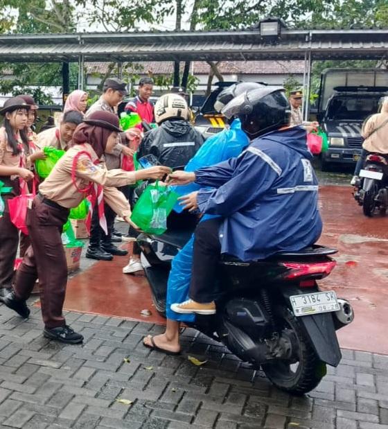 Pertama berkoordinasi dengan Polsek Argomulyo. Setelah itu dilaksanakan breafing peserta untuk pembagian peran dan tugas. Kegiatan ini dilaksanakan di halaman depan Polsek Argomulyo. Setiap peserta membawa bingkisan untuk dibagikan kepada masyarakat dengan dua sisi jalur sebelah kanan dan kiri. Saya berbagi tugas dengan teman teman. Kami berbagi beragam jenis makanan dan minuman mulai dari roti kering, kolek, air putih, kurma, jagung rebus.