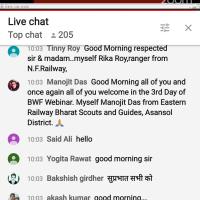Myself Suryasarathi Kumar, Scout of Santragachi South Group, South Eastern Railway BS&G I had attend The Better World Framework Webinar Series organized by National Headquarters The Bharat Scouts and Guides with a motive to implement various Projects throughout the country from grassroot level and provide a new learning opportunity and experience to young people as well as adult leaders to know in details about the various programmes... today's session was Champions for Nature Challenge (PANDA BADGE)& Earth Tribe Initiative.. from 10AM to 12PM on the official you tube channel @BSGIndia.