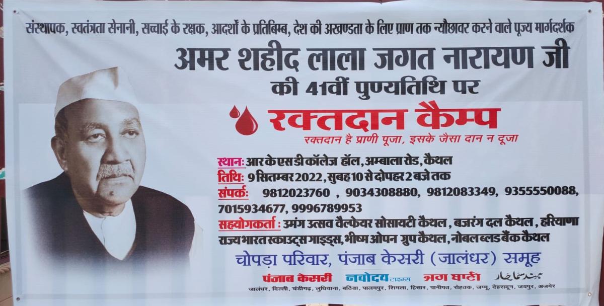 हरियाणा राज्य भारत स्काउट्स एंड गाइड्स भीष्म ओपन ग्रुप कैथल द्वारा पंजाब केसरी समाचार पत्र के संस्थापक लाला जगत नारायण जी की पुन्य तिथि पर पर उमंग उत्सव वैलफेयर सोसायटी के सहयोग से रक्त दान शिविर लगाया गया। जिसमें ने रक्तदान किया कार्यक्रम के मुख्यातिथि श्री रणदीप घनघस ( मीडिया को- ओडीनेटर टू सी एम्), विशिष्ट अतिथि श्रीमती सुरभि गर्ग ( चेयरपर्सन नगर परिषद कैथल) ,श्री अशोक गुज्जर ( जिलाअध्यक्ष भाजपा कैथल थे।