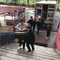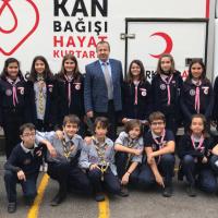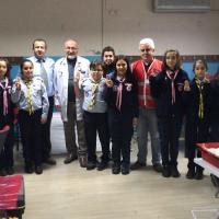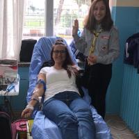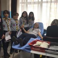 Our scouts worked during all day at a blood donation station which came to school . All day, they delivered many brochures, informed people, and collected 55 blood units and 4 stem cells.
