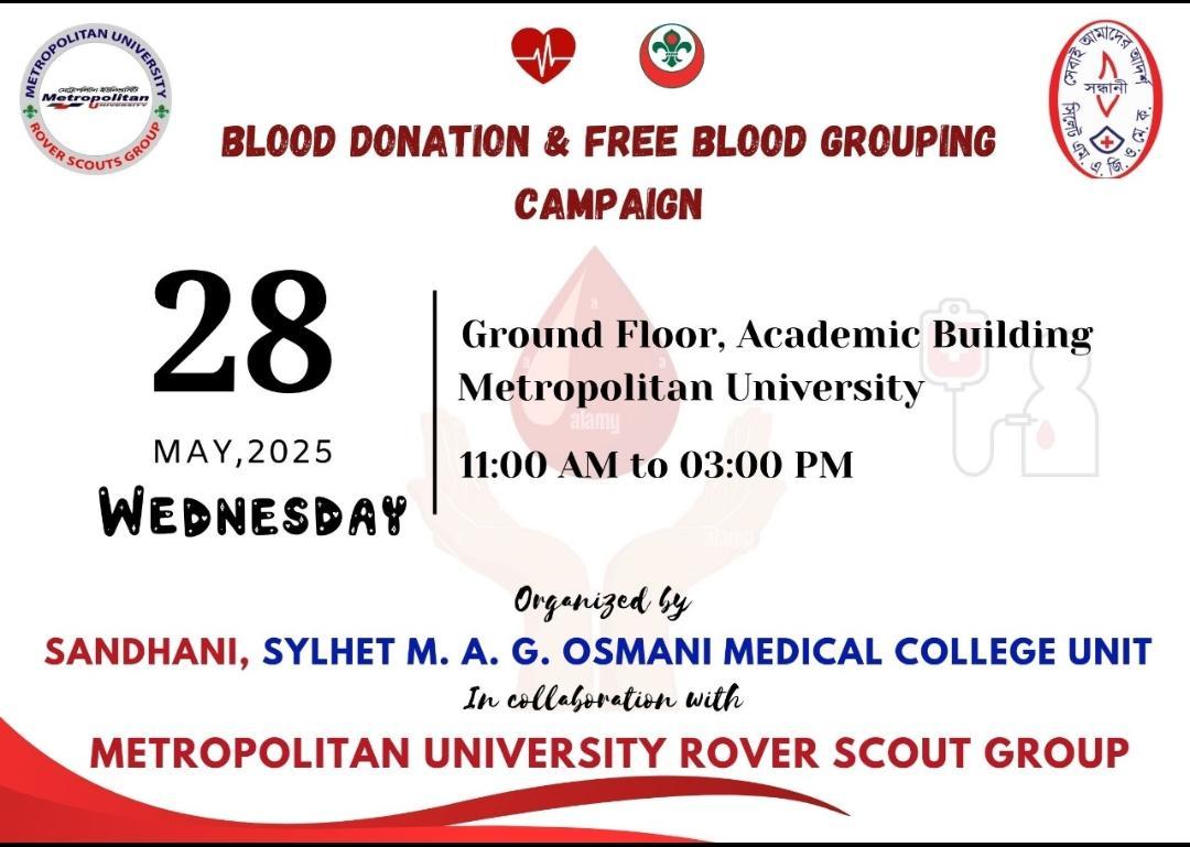 This blood donation program was organized by the Metropolitan University Rover Scouts Group. Awareness was raised through posters and social media. On the event day, a recognized blood bank collected blood after donor screening. Donors received refreshments and certificates. The initiative reflects the Scouts’ commitment to humanitarian service.