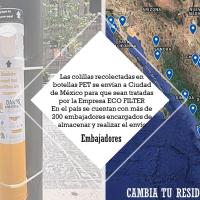 - Como proyecto se envían las colillas de cigarro a Ciudad de México, para que sean debidamente tratadas por la empresa ¨ECO FILTER MÉXICO¨ se realiza contacto con los embajadores encargados de almacenar y realizar dicho envío, existen más de 200 embajadores en México a los cuales contactar, depende mucho del lugar donde uno se encuentre y si existen embajadores en dicha ciudad. Es por ello que cada cierto tiempo esta empresa actualiza el mapa donde se encuentran dichos embajadores.