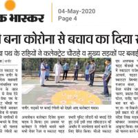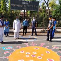 ]8 student team make a rangoli in collectrate nagaur .which aim to expain people to corona deasease.by rangoli explai to people to wear mask ,use sanitizer,handwash with soap and doctor ,nurse ,teacher, scout voluentier, cleaner men prevent to corona virus