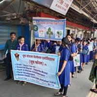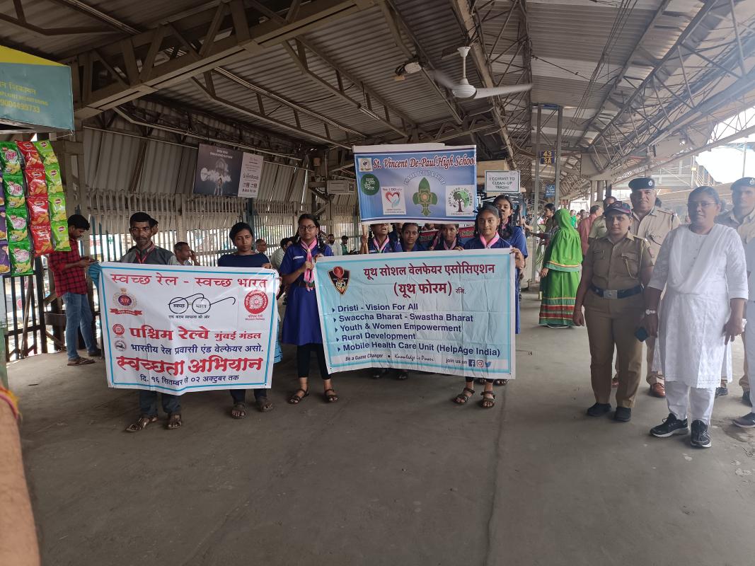On occasion of Gandhi Jayanti Kalpana Chawla guide company of St Vincent De Paul High school Organised Rally from school premises to Bhayandar Railway Station with Play cards of message of peace cleanliness and gender equality towards station .we reported at station master office where we had cleanliness drive.where guides communicated with comuters of local train and request and create awareness on keeping the station clean .
