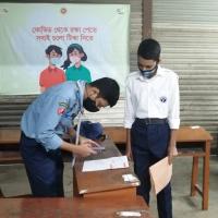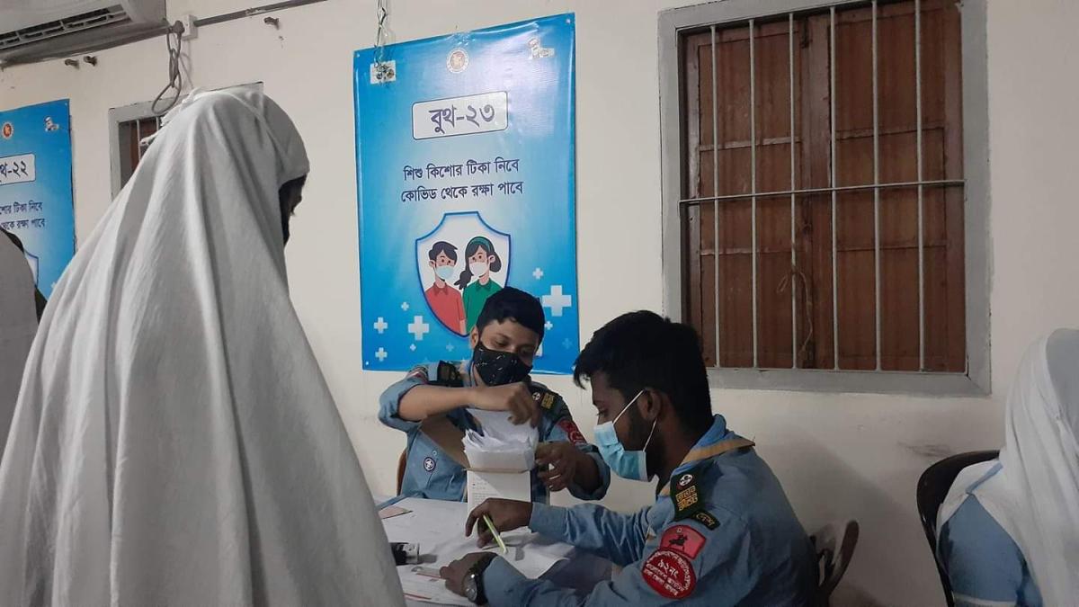 This is a program of the government of Bangladesh. Rover members of Bangladesh Scouts are volunteering to help students between the ages of 12 and 17 get the covid vaccine.
