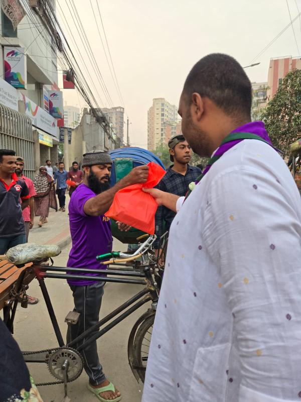 আমরা যারা প্রতিদিন নিয়মিত খাবার পাই, হয়তো বুঝতে পারি না যে কিছু মানুষ দিনের শেষে একবেলার আহারের জন্য কত সংগ্রাম করে। এই চিন্তা থেকেই আমরা সিদ্ধান্ত নিই এবং নিজেদের সামর্থ্য অনুযায়ী কিছু ইফতার এর ব্যবস্থা করে নিজেরা ৬০ প্যাকেট করি।ব্যাগ এ করে সুন্দর করে বেধে বের হই এবং রিকশাওয়ালা, গার্মেন্টসকর্মী,অসহায় মানুষদের দিয়ে সহযোগিতা করার চেষ্টা করি।