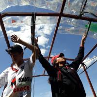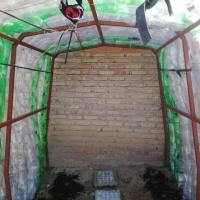 Se recolecto la mayor cantidad de botellas plasticas, de todos los colores, tamaƱos y formas, se les corto la base y se armo columnas, una encima de otra, estas columnas una al lado de otra, amarradas a un armazon prediseƱado llegaron a ser las paredes de un invernadero