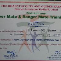 From 10-9-2016 to 11-9-2016 participated in the District Level ROVER & RANGER MATE TRAINING CAMP held at Dr.V.S Acharya Bharat Scouts & Guides District Training Centre, Pragathi Nagar, Alevoor, Udupi District ,Karnataka state. INDIA.