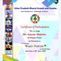 Uttar Pradesh had organise first Virtual Youth Forum on 22/04/2020 on the occasion of Earth Day which organized at the State Headquarters Lucknow of India Scouts and Guides. I participate in this forum and received a certificate of Participation.