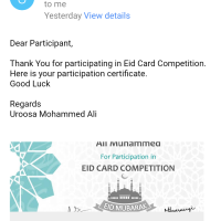 I am participate in Eid card competition In which I am made digital Eid card with a message for eid-al-fitr And finally I got certificate