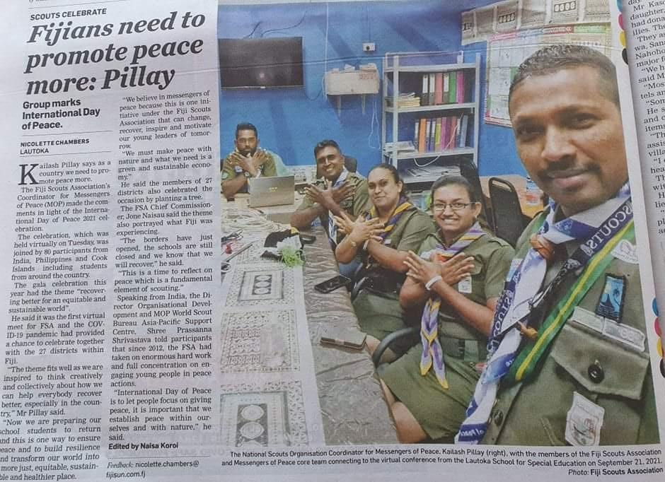 Fiji Scouts Association and Messengers of Peace had organized a first ever International Peace Day Virtual program project with the theme: Recovering Better for an Equitable & Sustainable World. A total of 1100 Messengers of Peace, Scouts, and Non-scouts Participated. Fiji Scouts Association was inspired by the Asia- Pacific Regional 10th year of Messengers of Peace virtual celebrations.