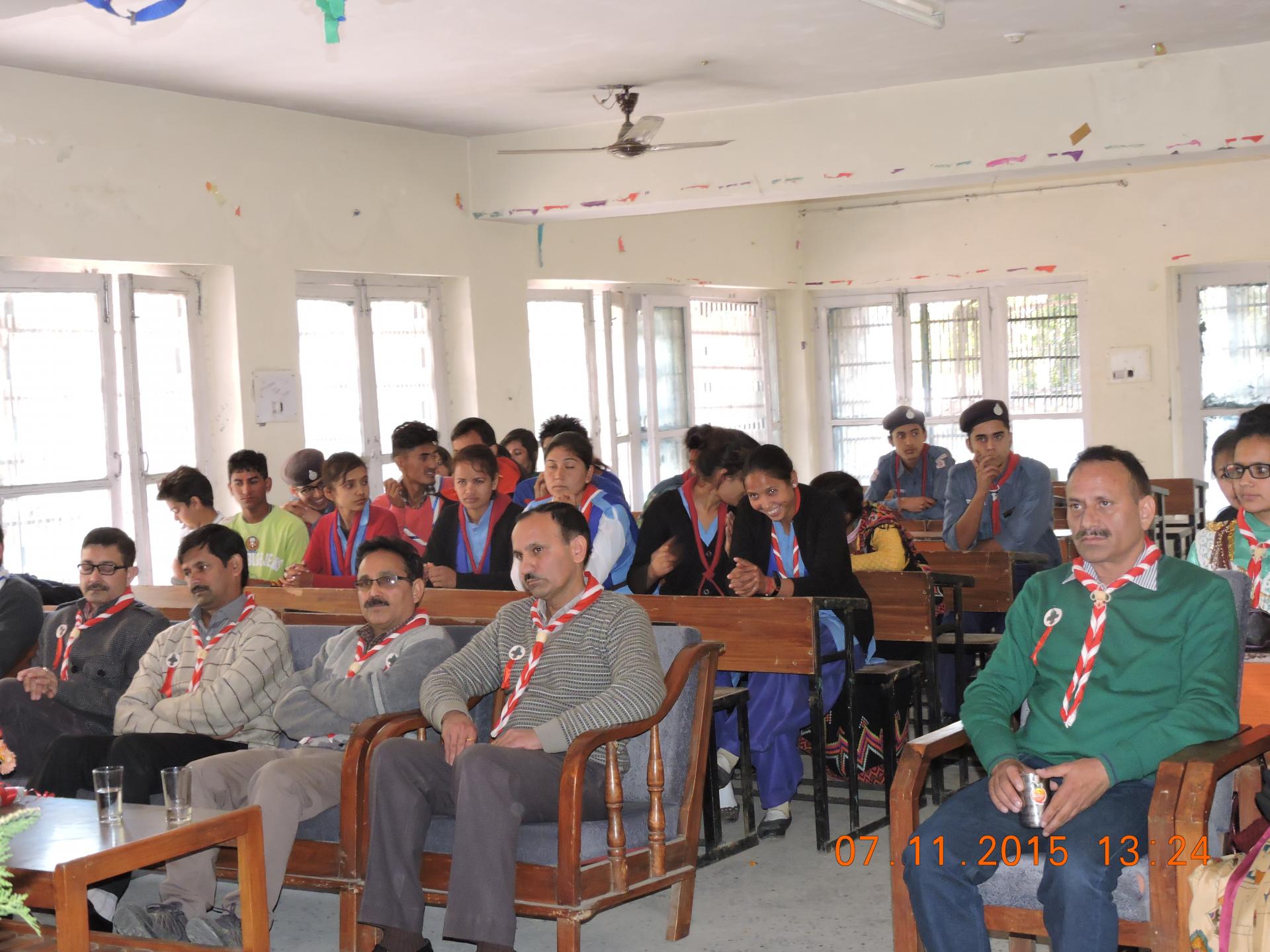 (Govt. College Kullu) 7th November 2015 Flag day of Bharat scout and Guide was celebrated in Govt. College Kullu. Group Leader Dr. N.L. Sharma was the chief guest for this event. Prof. Sunita Thakur was specially there to celebrate this day. It was organised by the help of Rover leader Prof. Shyam Singh and Ranger Leader Prof. Sakshi Rana. We first hosted the flag and then organised many competition for rovers and rangers like Declamation , Painting , Poster Making , Quiz, folk dance etc. Competition was based on Scouting. Chief Guest Dr. N.L. Sharma gave his blessings and appreciated the work done by rovers and rangers. Whole unit of GC kullu hosted the event and tried their best to make it successful. 20 rovers and rangers worked on 6th november and 70 rovers and rangers including other participants make themselves available on 7th November 2015. At last winners were awarded with prizes by honourable chief guest Dr. N.L. Sharma g.