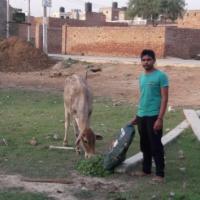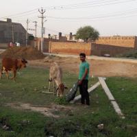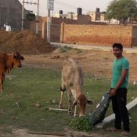 गाए को चारा डालते हुए।
