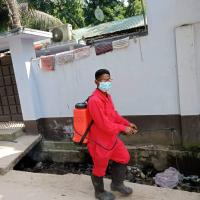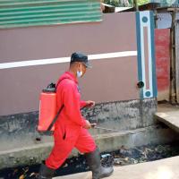 Giving poster for preventing dengue faverr. And spraying dengue prventing sprey.