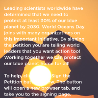 TAKE ACTION TODAY!! For 2020 World Oceans Day is growing the global movement to call on world leaders to protect 30% of our blue planet by 2030. This critical need is called 30x30. By safeguarding at least 30% of our ocean through a network of highly protected areas we can help ensure a healthy home for all.