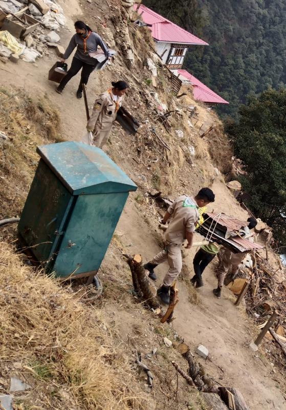 The project took place in Thimphu at Chari monastery where it was a reconstruction of the monastery. Starting from the base, we each took a sack of sand to the monastery and we picked up waste along the way and collected together and brought down. Then we carried woods upper the monastery and returned back with some waste as not empty handed. After reaching to the monastery we carried flat rocks just above of it which was heavy but for us Scouts not so heavy. At last it was successfully done.