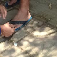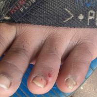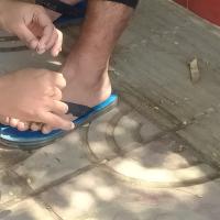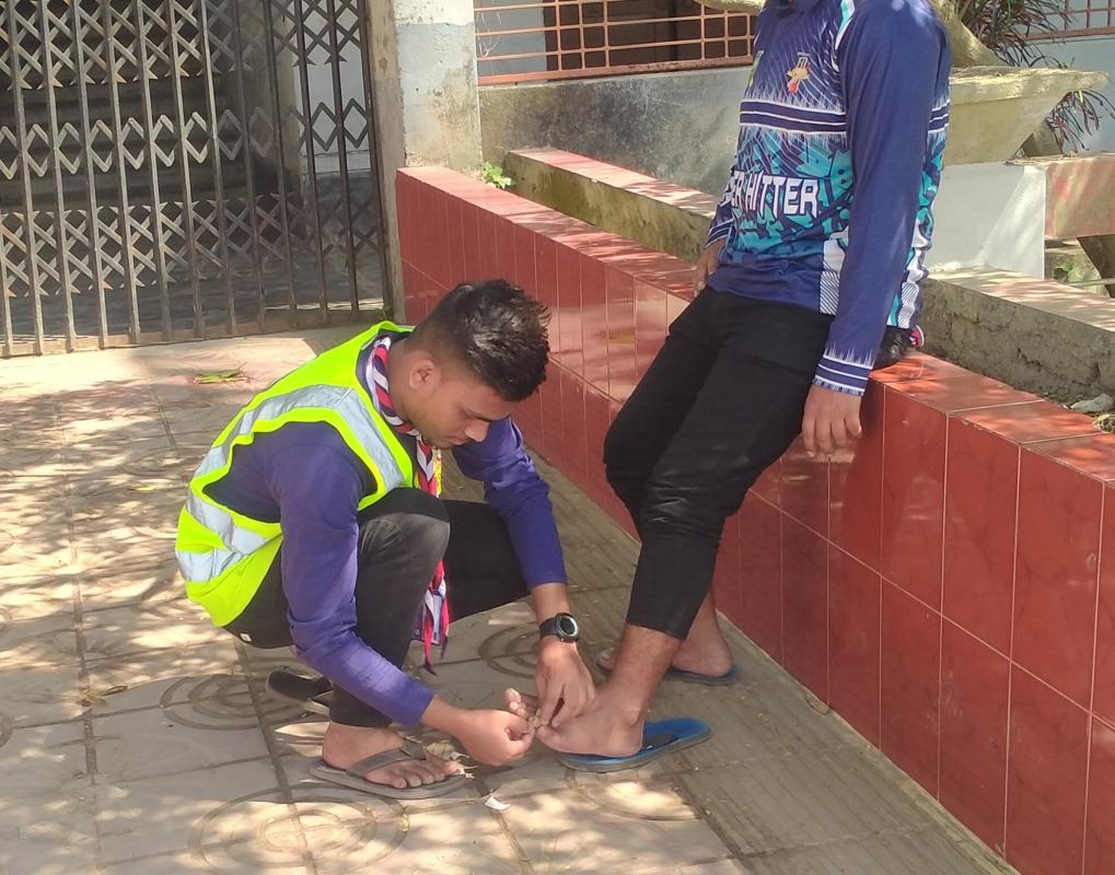 In an accident, one of my friends injured his leg and started bleeding. I give him first aid by immediately bandaging him with some herbal juice and cotton.
