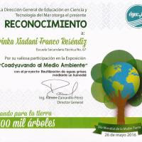 "REUTILIZACION DE AGUAS GRISES MEDIANTE UN HUMEDAL" Es un proyecto de Desarrollo Sustentable, consiste en una estructura integrada por dos filtros por el cual se recolecta el agua gris que proviene de los lavamanos, están aguas pasan por dos filtros. El primer Filtro consta de una roca grande con poros grandes llamada "Tezontle", esta primera etapa hace una filtración física ya que , la basura que puede contener el agua gris como lo es cabello, comida, jabón en barra, tierra, se queda en la roca. El segundo Filtro consta de una roca pequeña con poros pequeños llamada "Granzón" esta segunda etapa sigue haciendo una filtración física, cuando el agua gris pasa por este filtro el "Granzón" limpia el cloro, jabón liquido, etc. Los filtros tienen plantada una flor llamada "Cuna de Moises" la cual hace una filtración biológica ya que sus raíces se alimentan de las bacterias que contiene el agua. Sin embargo este no hace el agua potable, ya que a su vez también captura el agua pluvial y la podemos reutilizar para lavar ó regar áreas verdes. Este mismo proyecto participo en el Concurso "Zayed Future Energy Prize" en la Categoria de "Global High Schools" que busca inspirar a las futuras generaciones para lograr ciudadanos responsables. El Proyecto "Acciones Integrales para el Cuidado del Medio Ambiente" Fue evaluado y elegido entre más de 2,000 Proyectos del Continente en función de su impacto, innovación, liderazgo y visión a largo plazo. Obteniendo el 2°Lugar a Nivel Mundial. El reconocimiento se entregó en una ceremonia en los Emiratos Árabes en Enero 2017 a los representantes de la Institución. (Ligas del proyecto en Youtube). http://www.zayedfutureenergyprize.com/en/Meet-the-2017-Finalists/ http://www.youtube.com/watch?v=PJopturj4ck http://www.youtube.com/watch?v=6xhUOIMiG1U Este proyecto también participo en la "Dirección General de Educación, Ciencia y Tecnología del Mar" y por su destacada participación fue elegido para ser presentado ante la SEMARNAT en el "Día de la Tierra". El cual fue presentado ante escuelas del sector privado. Por último la SEP grabo un video del proyecto, el cual fue lanzado en la pagina oficial del Lic. Aurelio Nuño Mayer y a su vez tuvo una difusión en todos los canales de TV Culturales como el canal 11, Canal 22, Canal 34 y Canal 40. (Liga de Facebook Lic. Aurelio Nuño Mayer). http://m.facebook.com/story.php?story_fbid=1568173323204102&id=100000343488114 Todo este proyecto se llevo acabo bajo la Supervisión y Orientación de la Lic. Okantomi Libertad Martínez Ríos, Licenciada en Diseño de la Comunicación Gráfica por la UAM, con Maestría en Estudios Ambientales y de la Sustentabilidad por el IPN y Docente de Tecnología en Diseño Industrial, SEP.
