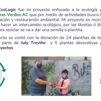 El impacto de Cuidar el medio ambiente y crear más áreas verdes dentro de los hogares de mi comunidad. I'ts all about EcoLogic fue mi proyecto enfocado a la ecología y trabajé con la asociación Gorras Verdes AC que por medio de actividades busca hacer conciencia para la conservación y restauración ambiental. Mi proyecto es reciclar las libretas y libros usados y hacer un intercambio ecológico, por las libretas ó libros usados que se entreguen para reciclar se va a dar una semilla o plantita.