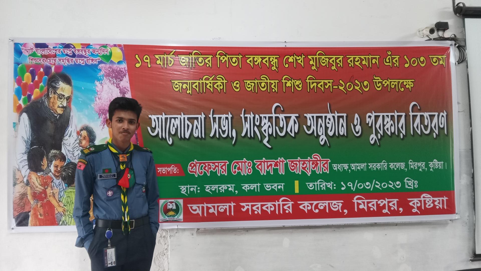 ১৭/০৩/২০২৩ জাতীয় শিশু দিবসে আমলা সরকারি কলেজ রোভার স্কাউট গ্রুপের সদস্যরা শ্রদ্ধাঞ্জলি অর্পণ,র্যালি,আলোচোনা সভা সহ সকল কার্যক্রমে সেবা প্রদান করে।