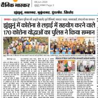आज दिनांक 7 मई 2020 को झुंझुनू जिला पुलिस प्रशासन ने कोरोना वॉरियर्स को एसपी महोदय के कर कमलों से प्रशस्ति पत्र देखकर सम्मानित किया गया जिसमें स्काउट गाइड, एनसीसी कैडर्स एवं भामाशाह तथा पुलिस मित्र शामिल थे।।